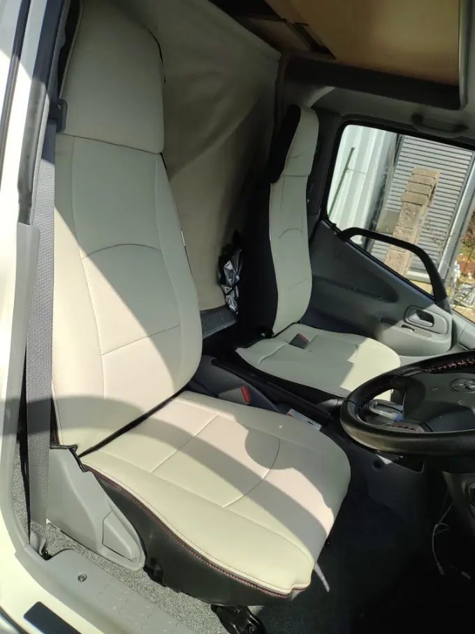 純正シートにジャストフィットです。車体が白なのでトラックベースのキャンピングカーに、白いシートカバーがとてもマッチして良かったです。