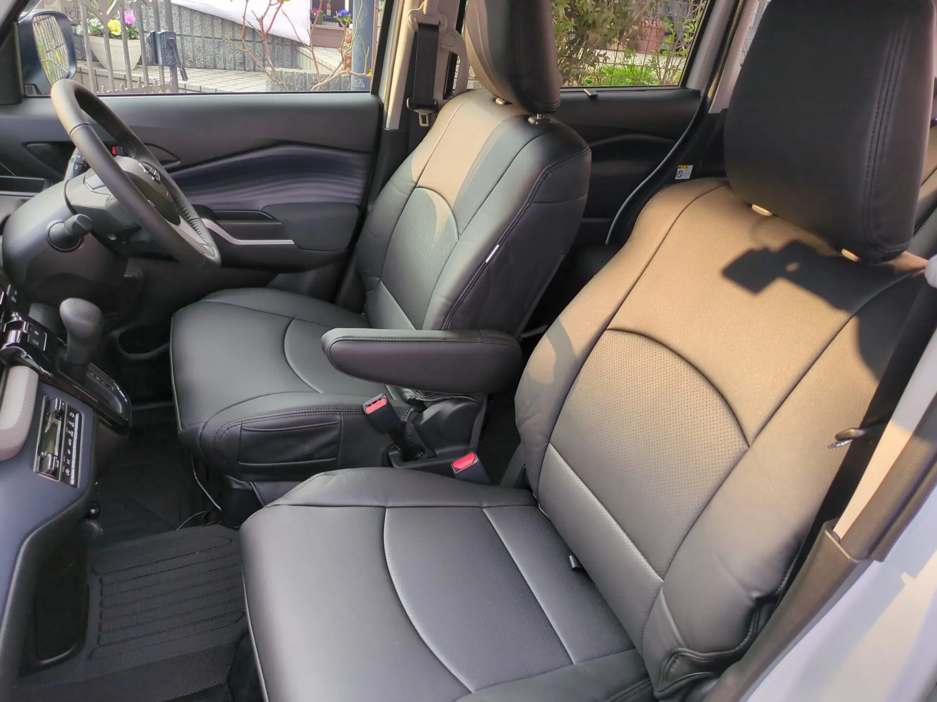 運転席のアームレスト、助手席座面下の収納ボックス、運転席・助手席背面のテーブル、後席が2分割で、前後にスライド・リクライニングするシートに対応し、 それらを作動させる肩部のレバー等、シートアレンジが多彩なソリオの機能全てに対応しており感動ものです。 また、シートカバーを装着し、高級感が増したソリオに改めて惚れました。